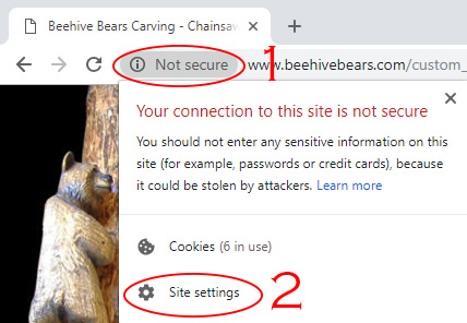 - In your CHROME browser Please click the "Not secure" text (#1) in your browser address bar, then the "Site Settings" icon (#2).