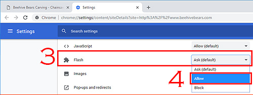 - In the new tab scroll down and to the right of "Flash" (#3), click the Down arrow (#4) and click "Allow".